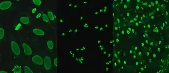 Hep-2 cells, originally of laryngeal carcinoma origin, are actually a contamination of HeLa cells.[26] They are routinely used in the diagnosis of ANA in diagnostic laboratories. HEp-2 cells provide a greater ability to differentiate patterns of ANA than animal sections, due to the large nuclei and high mitotic rate of the cell line. Upon incubation with serum containing anti-dsDNA antibodies and fluorescent labelled secondary antibodies, homogeneous staining of interphase nuclei and condensed chromosomal staining of mitotic cells can be seen.[27]