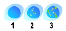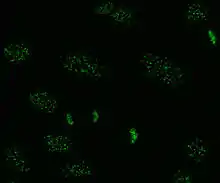There are many nuclear staining patterns seen on HEp-2 cells: homogeneous, speckled, nucleolar, nuclear membranous, centromeric, nuclear dot and pleomorphic. The homogeneous pattern is seen when the condensed chromosomes and interphase chromatin stain. This pattern is associated with anti-dsDNA antibodies, antibodies to nucleosomal components, and anti-histone antibodies. There are two speckled patterns: fine and coarse. The fine speckled pattern has fine nuclear staining with unstained metaphase chromatin, which is associated with anti-Ro and anti-La antibodies. The coarse staining pattern has coarse granular nuclear staining, caused by anti-U1-RNP and anti-Sm antibodies. The nucleolar staining pattern is associated with many antibodies including anti-Scl-70, anti-PM-Scl, anti-fibrillarin and anti-Th/To. Nuclear membrane staining appears as a fluorescent ring around the cell nucleus and are produced by anti-gp210 and anti-p62 antibodies. The centromere pattern shows multiple nuclear dots in interphase and mitotic cells, corresponding to the number of chromosomes in the cell. Nuclear dot patterns show between 13 and 25 nuclear dots in interphase cells and are produced by anti-sp100 antibodies. Pleomorphic pattern is caused by antibodies to the proliferating cell nuclear antigen.[25][52][56][57] Indirect immunofluorescence has been shown to be slightly superior compared to ELISA in detection of ANA from HEp-2 cells.[53]
