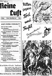 Well-known health magazines like the Gesundes Volk (Healthy People),[34] Volksgesundheit (People's Health) and Gesundes Leben (Healthy Life)[54] also published warnings about the health consequences of smoking[34][54] and posters showing the harmful effects of tobacco were displayed.[34] Some anti-smoking posters were unapproved and indeed censured by the government.[9] Editorials discussing the issue of smoking and its effects were published in newspapers.[55] Articles advocating nonsmoking were also published in the magazines Die Genussgifte (The Recreational Stimulants), Auf der Wacht (On the Guard) and Reine Luft (Clean Air).[56] Out of these magazines, Reine Luft was the main journal of the anti-tobacco movement.[1][8] Karl Astel's Institute for Tobacco Hazards Research at Jena University purchased and distributed hundreds of reprints from Reine Luft.[8] The magazine was published by tobacco control activists; it was later, in 1941, ordered by the propaganda ministry to moderate its tone and submit all material for pre-approval.[9]