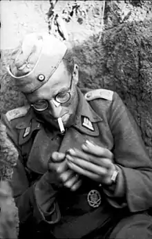 Smoking was common in the Wehrmacht; a 1944 survey found that 87% of servicemen smoked. 10% of servicemen had begun smoking while in the military, and only seven servicemen of the thousand surveyed (0.7%) had given it up.[1] However, as in the general population, the number of smokers rose while the number of cigarettes smoked fell. As a result of the anti-tobacco measures implemented in the Wehrmacht (supply restriction, taxes, and propaganda),[1] the total tobacco consumption by soldiers decreased between 1939 and 1945.[21] Average tobacco consumption per person among military personnel declined by 23.4% compared to the immediate pre-World War II years. The number of servicemen who smoked 30 or more cigarettes per day (well above the theoretical maximum military ration of 7.7 cigarettes per day)[75] declined from 4.4% to 0.3%.[1]