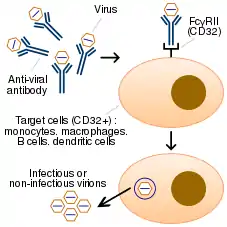Antibody-dependent enhancement (ADE), sometimes less precisely called immune enhancement or disease enhancement, is a phenomenon in which binding of a virus to suboptimal antibodies enhances its entry into host cells, followed by its replication.[1][2] Antiviral antibodies promote viral infection of target immune cells by exploiting the phagocytic FcγR or complement pathway.[3] After interaction with the virus the antibody binds Fc receptors (FcR) expressed on certain immune cells or some of the complement proteins. FcγR binds antibody via its fragment crystallizable region (Fc). Usually the process of phagocytosis is accompanied by the virus degradation, however, if the virus is not neutralized (either due to low affinity binding or targeting to a non-neutralizing epitope), antibody binding might result in a virus escape and therefore, enhanced infection. Thus, phagocytosis can cause viral replication, with the subsequent death of immune cells. The virus “deceives” the process of phagocytosis of immune cells and uses the host's antibodies as a Trojan horse. ADE may occur due to the non-neutralizing characteristic of the antibody, which bind viral epitopes other than those involved in a host cell attachment and entry. ADE may also happen due to the presence of sub-neutralizing concentrations of antibodies (binding to viral epitopes below the threshold for neutralization).[4] In addition ADE can be induced when the strength of antibody-antigen interaction is below the certain threshold.[5][6] This phenomenon might lead to both increased virus infectivity and virulence. The viruses that can cause ADE frequently share some common features such as antigenic diversity, abilities to replicate and establish persistence in immune cells.[1] ADE can occur during the development of a primary or secondary viral infection, as well as after vaccination with a subsequent virus challenge.[1][7][8] It has been observed mainly with positive-strand RNA viruses. Among them are Flaviviruses such as Dengue virus,[9] Yellow fever virus, Zika virus,[10][11] Coronaviruses, including alpha- and betacoronaviruses,[12] Orthomyxoviruses such as influenza,[13] Retroviruses such as HIV,[14][15][16] and Orthopneumoviruses such as RSV.[17][18][19]