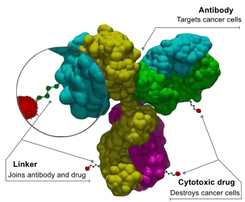 ADCs are complex molecules composed of an antibody linked to a biologically active cytotoxic (anticancer) payload or drug.[3] Antibody-drug conjugates are examples of bioconjugates and immunoconjugates.