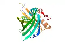 Characteristic for Anticalin proteins is their barrel structure formed by eight antiparallel β-strands pairwise connected by loops and an attached α-helix. The main structure of Anticalin proteins is identical to wild type lipocalins. Conformational deviations are primarily located in the four loops reaching in the ligand binding site.[2] Mutagenesis of amino acids at the binding site allows for changing the affinity and selectivity.