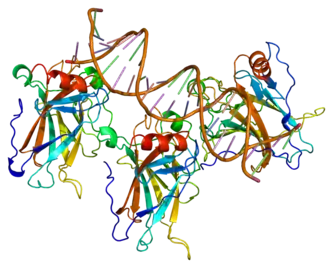 The p53 protein is a tumor-suppressing transcription factor (TF), which can recognize when there is an alteration in a cell's DNA caused by factors including chemical toxins, radiation, ultraviolet (UV) rays, and other damaging agents.[53] Crucially, p53 plays a role in determining whether the damaged genetic material in the cell can be repaired, or if the cell should be destroyed through apoptosis.[54][55] The individual topologically associating domains (TADs) target different genes and unique effector pathways. It has been observed that inactivating both of the TADs detrimentally affects the ability of p53 to suppress tumor growth and interact with target genes. When only one TAD is inactivated, p53 can still suppress specific tumors; however, it can no longer successfully engage in transactivation. The C-terminal domain (CTD) is an intrinsically disordered domain (IDD), which can take on different conformations depending on what it is binding with and is a location of many post-translational modifications, resulting in its ability to regulate p53 function depending on what it is bound to and what modifications are linked with the CTD. This domain also aids in the binding of the central DNA-binding domain (DBD) to specific DNA sequences; the CTD is a positive regulator of DNA binding and stabilizes the interaction of the DNA with the DBD.[53] p53 is unique as a transcription factor in that it can recognize and bind response elements (RE) in many different environments and doesn't need other transcription factors to cooperatively bind with it like many other TFs.[53]