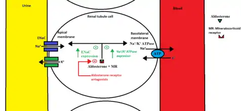 Aldosterone is a mineralocorticoid which is synthesized in the adrenal glands.[5] When aldosterone is secreted from the adrenal glands, it binds to the mineralocorticoid receptor in the renal tubule cell and forms a complex.[6] This complex enhances transcription of specific DNA segments in the nucleus, leading to the formation of two protein transporters, Na+/K+ ATPase pump at the basolateral membrane and Na+ channel called ENaC, located at the apical membrane of the renal tubule cell.[6] These protein transporters increase sodium reabsorption and potassium excretion in the distal tubule and the collecting duct of the kidneys. This helps the body to maintain normal volume status and electrolyte balance, increasing the blood pressure.
