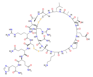 Apamin is a polypeptide possessing an amino acid sequence of H-Cys-Asn-Cys-Lys-Ala-Pro-Glu-Thr-Ala-Leu-Cys-Ala-Arg-Arg-Cys-Gln-Gln-His-NH2 (with disulfide bonds between Cys1-Cys11 and Cys3-Cys15). Apamin is very rigid because of the two disulfide bridges and seven hydrogen bonds. The three-dimensional structure of apamin has been studied with several spectroscopical techniques: HNMR, Circular Dichroism, Raman spectroscopy, FT-IR. The structure is presumed to consist of an alpha-helix and beta-turns, but the exact structure is still unknown.[5]