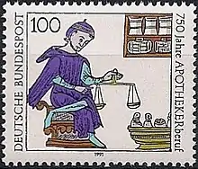 The apothecaries' system, or apothecaries' weights and measures, is a historical system of mass and volume units that were used by physicians and apothecaries for medical recipes and also sometimes by scientists.[1][2][3] The English version of the system is closely related to the English troy system of weights, the pound and grain being exactly the same in both.[4] It divides a pound into 12 ounces, an ounce into 8 drachms, and a drachm into 3 scruples of 20 grains each. This exact form of the system was used in the United Kingdom; in some of its former colonies, it survived well into the 20th century.[5][6] The apothecaries' system of measures is a similar system of volume units based on the fluid ounce. For a long time, medical recipes were written in Latin, often using special symbols to denote weights and measures.