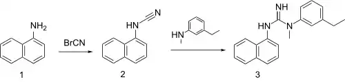 1-Naphthylamine is reacted with cyanogen bromide to give 2. Treatment of this intermediate with 3-ethyl-N-methylaniline leads to addition to the cyano group and formation of the corresponding diaryl guanidine, aptiganel, 3.