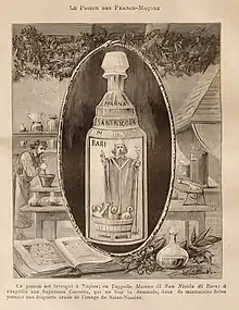 Perhaps an older recipe had been refined by Tofana and her daughter, Girolama Spera, around 1650 in Rome. The 'tradename' "Manna di San Nicola", i.e. "Manna of St. Nicholas of Bari" might have been a marketing device intended to divert the authorities, since the poison was openly sold both as a cosmetic and a devotionary object in vials that included a picture of St. Nicholas. Some of her customers claimed to have used it for its advertised purposes and caused deaths only accidentally. Over 600 victims are alleged to have died from this poison, mostly abusive husbands, in a time where women did not have any rights or protection. Tofana was arrested and confessed to producing the poison, and she implicated a number of her clients, claiming that they knew what they were buying. She was executed in July 1659. There was much disquiet throughout Italy and many of her clients fled, while others were strangled in prison, and indeed many were publicly executed. Between 1666 and 1676 the Marchioness de Brinvilliers poisoned her father, two brothers, amongst others, and was executed on July 16, 1676.[2]