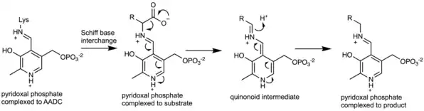 The enzyme uses pyridoxal phosphate (PLP), the active form of vitamin B6, as a cofactor. PLP is essential to the mechanism of decarboxylation in AADC. In the active enzyme, PLP is bound to lysine-303 of AADC as a Schiff base. Upon substrate binding, Lys-303 is displaced by the substrate's amine. This positions the carboxylate of the substrate within the active site such that decarboxylation is favored. Decarboxylation of the substrate produces a quinonoid intermediate, which is subsequently protonated to produce a Schiff base adduct of PLP and the decarboxylated product. Lys-303 can then regenerate the original Schiff base, releasing the product while retaining PLP.[2]