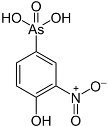 A large variety of organoarsenic compounds are known. Several were developed as chemical warfare agents during World War I, including vesicants such as lewisite and vomiting agents such as adamsite.[34][35][36] Cacodylic acid, which is of historic and practical interest, arises from the methylation of arsenic trioxide, a reaction that has no analogy in phosphorus chemistry. Cacodyl was the first organometallic compound known (even though arsenic is not a true metal) and was named from the Greek κακωδἰα "stink" for its offensive odor; it is very poisonous.[37]