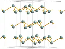 The three most common arsenic allotropes are gray, yellow, and black arsenic, with gray being the most common.[14] Gray arsenic (α-As, space group R3m No. 166) adopts a double-layered structure consisting of many interlocked, ruffled, six-membered rings. Because of weak bonding between the layers, gray arsenic is brittle and has a relatively low Mohs hardness of 3.5. Nearest and next-nearest neighbors form a distorted octahedral complex, with the three atoms in the same double-layer being slightly closer than the three atoms in the next.[15] This relatively close packing leads to a high density of 5.73 g/cm3.[16] Gray arsenic is a semimetal, but becomes a semiconductor with a bandgap of 1.2–1.4 eV if amorphized.[17] Gray arsenic is also the most stable form.