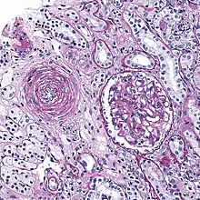 This is a type of arteriolosclerosis involving a narrowed lumen.[4] The term "onion-skin" is sometimes used to describe this form of blood vessel[8] with thickened concentric smooth muscle cell layer and thickened, duplicated basement membrane. In malignant hypertension these hyperplastic changes are often accompanied by fibrinoid necrosis of the arterial intima and media. These changes are most prominent in the kidney and can lead to ischemia and acute kidney failure.