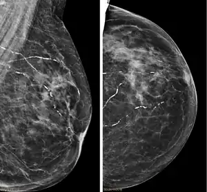 Right breast mammograms showing several calcified arterioles. Patient 94 years old.