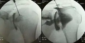 Shoulder arthrography can be used to study tears of the rotator cuff, glenoid labrum and biceps.[1] The type of contrast injected into the joint depends on the subsequent imaging that is planned. For pneumoarthrography, gas is used, for CT or radiographs, a water-soluble radiopaque contrast, and for MRI, gadolinium. Double-contrast arthrography can be used for more anatomically complex cases, though its use is relatively infrequent. The needle is radiographically guided into the glenohumeral joint space, after which the patient is evaluated by fluoroscopy, CT or MRI. The gadolinium in the contrast fluid yields a bright signal on T1 weighted images allowing for better evaluation of the joint capsule, the articular surface of the bones and, in particular, the labral cartilage. MR arthrography is most often used in evaluation of the hip and acetabular labrum, of the shoulder rotator cuff and glenoid labrum, and less often in the wrist.[1] Arthrograms can be diagnostic and therapeutic. Therapeutic arthrograms often distend the joint with cortisone and lidocaine, with a common site being the shoulder. Diagnostic arthrograms can be direct, as described above with penetration of the joint, or indirect, by a venous injection of contrast material and delayed imaging with CT or MRI.[1]