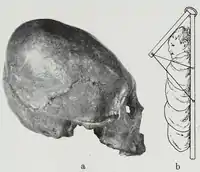 The earliest suggested examples were once thought to include Neanderthals and the Proto-Neolithic Homo sapiens component (ninth millennium BC) from Shanidar Cave in Iraq,[3][4][5] The view that the Neanderthal skull was artificially deformed, thus representing the oldest example of such practices by tens of thousands of years, has since been argued incorrect by Chech, Grove, Thorne, and Trinkaus, based on new cranial reconstructions in 1999, where the team concluded "we no longer consider that artificial cranial deformation can be inferred for the specimen".[6] It thought elongated skulls found among Neolithic peoples in Southwest Asia were the result of artificial cranial deformation.[3][7]