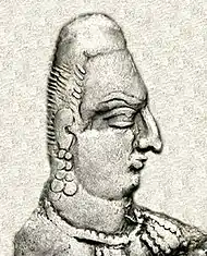 The Alchon Huns are generally recognized by their elongated skull, a result of artificial skull deformation, which may have represented their "corporate identity".[15] The elongated skulls appears clearly in most of the portaits of rulers in the coinage of the Alkhon Huns, and most visibly on the coinage of Khingila.[15] These elongated skulls, which they obviously displayed with pride, distinguished them from other peoples, such as their predecessors the Kidarites.[15] On their coins, the spectacular skulls came to replace the Sasanian-type crowns which had been current in the coinage of the region.[15]