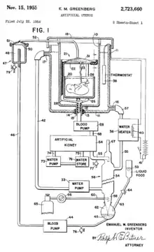On 22 July 1954 Emanuel M. Greenberg filed a patent on the design for an artificial womb.[16] The patent included two images of the design for an artificial womb. The design itself included a tank to place the fetus filled with amniotic fluid, a machine connecting to the umbilical cord, blood pumps, an artificial kidney, and a water heater. He was granted the patent on 15 November 1955.[16]