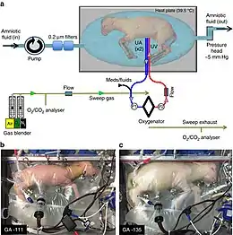In 2017, researchers at the Children's Hospital of Philadelphia were able to further develop the extra-uterine system. The study uses fetal lambs which are then placed in a plastic bag filled with artificial amniotic fluid.[1][7] The system consist in 3 main components: a pumpless arteriovenous circuit, a closed sterile fluid environment and an umbilical vascular access. Regarding the pumpless arteriovenous circuit, the blood flow is driven exclusively by the fetal heart, combined with a very low resistance oxygenator to most closely mimic the normal fetal/placental circulation. The closed sterile fluid environment is important to ensure sterility. Scientists developed a technique for umbilical cord vessel cannulation that maintains a length of native umbilical cord (5–10 cm) between the cannula tips and the abdominal wall, to minimize decannulation events and the risk of mechanical obstruction.[19]The umbilical cord of the lambs are attached to a machine outside of the bag designed to act like a placenta and provide oxygen and nutrients and also remove any waste.[1][7] The researchers kept the machine "in a dark, warm room where researchers can play the sounds of the mother's heart for the lamb fetus."[7] The system succeeded in helping the premature lamb fetuses develop normally for a month.[7] Indeed, scientists have run 8 lambs with maintenance of stable levels of circuit flow equivalent to the normal flow to the placenta. Specifically, they have run 5 fetuses from 105 to 108 days of gestation for 25–28 days, and 3 fetuses from 115 to 120 days of gestation for 20–28 days. The longest runs were terminated at 28 days due to animal protocol limitations rather than any instability, suggesting that support of these early gestational animals could be maintained beyond 4 weeks.[20] Alan Flake, a fetal surgeon at the Children's Hospital of Philadelphia hopes to move testing to premature human fetuses, but this could take anywhere from three to five years to become a reality.[7] Flake, who led the study, calls the possibility of their technology recreating a full pregnancy a "pipe dream at this point" and does not personally intend to create the technology to do so.[7]