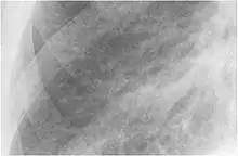 Asbestosis is long-term inflammation and scarring of the lungs due to asbestos fibers.[4] Symptoms may include shortness of breath, cough, wheezing, and chest tightness.[1] Complications may include lung cancer, mesothelioma, and pulmonary heart disease.[1][2]