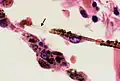 The black arrows point to ferrugionous bodies that are located at the periphery of a focus of non-small cell lung carcinoma, NOS.