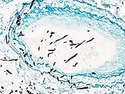 On microscopy, Aspergillus species are reliably demonstrated by silver stains, e.g., Gridley stain or Gomori methenamine-silver.[13] These give the fungal walls a gray-black colour. The hyphae of Aspergillus species range in diameter from 2.5 to 4.5 µm. They have septate hyphae,[14] but these are not always apparent, and in such cases they may be mistaken for Zygomycota.[13] Aspergillus hyphae tend to have dichotomous branching that is progressive and primarily at acute angles of around 45°.[13]