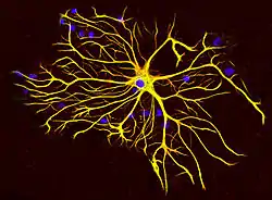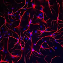 Astrocytes are a sub-type of glial cells in the central nervous system. They are also known as astrocytic glial cells. Star-shaped, their many processes envelop synapses made by neurons. In humans, a single astrocyte cell can interact with up to 2 million synapses at a time.[7] Astrocytes are classically identified using histological analysis; many of these cells express the intermediate filament glial fibrillary acidic protein (GFAP).[8] Several forms of astrocytes exist in the central nervous system including fibrous (in white matter), protoplasmic (in grey matter), and radial. The fibrous glia are usually located within white matter, have relatively few organelles, and exhibit long unbranched cellular processes. This type often has astrocytic endfoot processes that physically connect the cells to the outside of capillary walls when they are in proximity to them. The protoplasmic glia are the most prevalent and are found in grey matter tissue, possess a larger quantity of organelles, and exhibit short and highly branched tertiary processes. The radial glial cells are disposed in planes perpendicular to the axes of ventricles. One of their processes abuts the pia mater, while the other is deeply buried in gray matter. Radial glia are mostly present during development, playing a role in neuron migration. Müller cells of the retina and Bergmann glia cells of the cerebellar cortex represent an exception, being present still during adulthood. When in proximity to the pia mater, all three forms of astrocytes send out processes to form the pia-glial membrane.