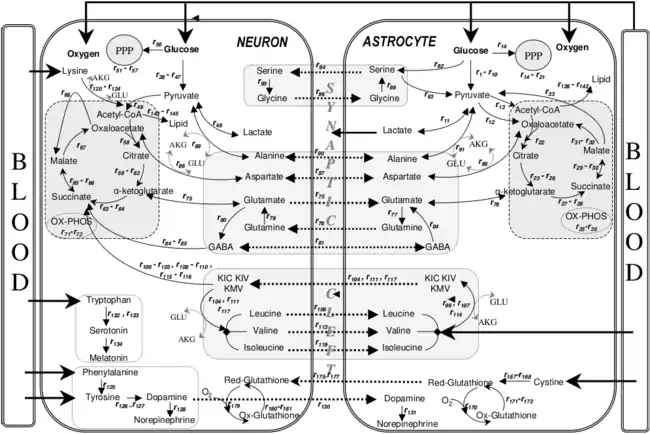 12. Cakir T, Alsan S, Saybaşili H, Akin A, Ulgen KO (December 2007). "Reconstruction and flux analysis of coupling between metabolic pathways of astrocytes and neurons: application to cerebral hypoxia". Theoretical Biology & Medical Modelling. 4 (1): 48. doi:10.1186/1742-4682-4-48. PMC 2246127. PMID 18070347.