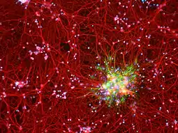 • Nervous system repair: Upon injury to nerve cells within the central nervous system, astrocytes fill up the space to form a glial scar, and may contribute to neural repair. The role of astrocytes in CNS regeneration following injury is not well understood though. The glial scar has traditionally been described as an impermeable barrier to regeneration, thus implicating a negative role in axon regeneration. However, recently, it was found through genetic ablation studies that astrocytes are actually required for regeneration to occur.[28] More importantly, the authors found that the astrocyte scar is actually essential for stimulated axons (that axons that have been coaxed to grow via neurotrophic supplementation) to extend through the injured spinal cord.[28] Astrocytes that have been pushed into a reactive phenotype (termed astrogliosis, defined by upregulation of GFAP expression, a definition still under debate) may actually be toxic to neurons, releasing signals that can kill neurons.[29] Much work, however, remains to elucidate their role in nervous system injury.