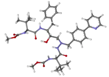 Atazanavir binds to the active site HIV protease and prevents it from cleaving the pro-form of viral proteins into the working machinery of the virus.[9] If the HIV protease enzyme does not work, the virus is not infectious, and no mature virions are made.[10][11] The azapeptide drug was designed as an analog of the peptide chain substrate that HIV protease would cleave normally into active viral proteins. More specifically, atazanavir is a structural analog of the transition state during which the bond between a phenylalanine and proline is broken.[12][13] Humans do not have any enzymes that break bonds between phenylalanine and proline, so this drug will not target human enzymes.