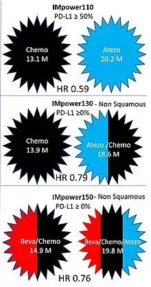 Text was copied from this source, which is available under a Creative Commons Attribution 4.0 International License. - Socinski, Mark A.; Jotte, Robert M.; Cappuzzo, Federico; Orlandi, Francisco; Stroyakovskiy, Daniil; Nogami, Naoyuki; Rodríguez-Abreu, Delvys; Moro-Sibilot, Denis; Thomas, Christian A.; Barlesi, Fabrice; Finley, Gene (4 June 2018). "Atezolizumab for First-Line Treatment of Metastatic Nonsquamous NSCLC". New England Journal of Medicine. doi:10.1056/NEJMoa1716948.
