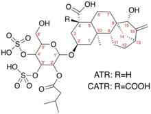 A modified variant of the atractylenolide carries an additional carboxyl group at the C4 atom of the atractyligenin, which is then referred to as carboxy-atractyloside (CATR), sometimes referred to as "gummiferin".[9][10] The ATR/CATR chemical structure on the right indicates this difference between compounds.[11]