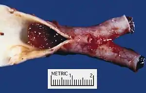 A myxoma is a rare benign tumor of the heart. Myxomata are the most common primary cardiac tumor in adults, and are most commonly found within the left atrium near the valve of the fossa ovalis. Myxomata may also develop in the other heart chambers.[1] The tumor is derived from multipotent mesenchymal cells.[1] Cardiac myxoma can effect adults between 30 and 60 years of age.[2]