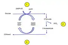 Fermentation is a biochemical process during which yeast and certain bacteria convert sugars to ethanol, carbon dioxide, as well as other metabolic byproducts.[10][11] The fermentation pathway involves pyruvate formed from yeast in the EMP pathway, while some bacteria obtain pyruvate through the ED pathway.[10] Pyruvate is then decarboxylated to acetaldehyde in a reaction involving the enzyme pyruvate decarboxylase.[10] Reduction of acetaldehyde to ethanol produces NAD+, which is catalyzed by alcohol dehydrogenase (ADH).[10] ADH rids the body of alcohol through a process called first pass metabolism.[7] However, if the rate of ethanol breakdown is less than the rate of production, intoxication ensues.
