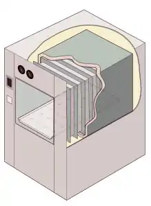 Cutaway illustration of a jacketed rectangular-chamber autoclave