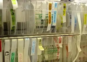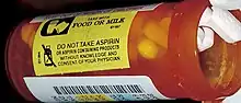 An auxiliary label (also called cautionary and advisory label or prescription drug warning label) is a label added on to a dispensed medication package by a pharmacist in addition to the usual prescription label. These labels are intended to provide supplementary information regarding safe administration, use, and storage of the medication.[1] Auxiliary labels provide information which can augment but not replace verbal counselling from a pharmacist.[2]