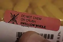 Auxiliary labels are generally small stickers consisting of a pictogram and one or more lines of text intended to enhance patient knowledge. They generally contain information not contained in the "directions" on the prescription label itself. This can include supplementary directions for administration, whether the medication can be chewed, crushed, or cut, and information on side effects or drug/food interactions.[3][4] All auxiliary labels contain information important to proper medication adherence, or to avoid adverse drug reactions.[5] There is not one guideline for how to best formulate auxiliary labels on a prescription, but the label should be as simple as possible and written in plain language.[4]