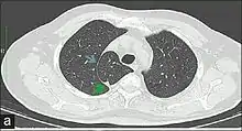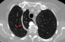 In human anatomy, an azygos lobe is a normal anatomical variation of the upper lobe of the right lung.[1] It is seen in 1% of the population. Embryologically, it arises from an anomalous lateral course of the azygos vein,[2] in a pleural septum within the apical segment of the right upper lobe or in other words an azygos lobe is formed when the right posterior cardinal vein, one of the precursors of the azygos vein, fails to migrate over the apex of the lung and penetrates it instead, carrying along two pleural layers that invaginates into the upper portion of the right upper lobe. As it has no bronchi, veins and arteries of its own or corresponding alteration in the segmental architecture of the lung, so it is not a true (misnomer), or even accessory, pulmonary lobe, but rather an anatomically separated part of the upper lobe.
