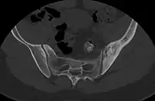 CT scan of primary B cell lymphoma in the left ilium, as diffuse cortical and trabecular thickening of the hemipelvis, mimicking Paget's disease.[2]