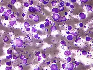 Micrograph showing Hodgkin's lymphoma, a type of B cell lymphoma that is usually considered separate from other B cell lymphomas. Field stain.