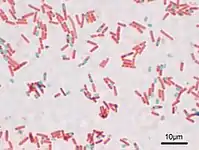 Bacillus subtilis is a Gram-positive bacterium, rod-shaped and catalase-positive. It was originally named Vibrio subtilis by Christian Gottfried Ehrenberg,[3] and renamed Bacillus subtilis by Ferdinand Cohn in 1872[4] (subtilis being the Latin for "fine"). B. subtilis cells are typically rod-shaped, and are about 4–10 micrometers (μm) long and 0.25–1.0 μm in diameter, with a cell volume of about 4.6 fL at stationary phase.[5] As with other members of the genus Bacillus, it can form an endospore, to survive extreme environmental conditions of temperature and desiccation.[6] B. subtilis is a facultative anaerobe[7] and had been considered as an obligate aerobe until 1998. B. subtilis is heavily flagellated, which gives it the ability to move quickly in liquids. B. subtilis has proven highly amenable to genetic manipulation, and has become widely adopted as a model organism for laboratory studies, especially of sporulation, which is a simplified example of cellular differentiation. In terms of popularity as a laboratory model organism, B. subtilis is often considered as the Gram-positive equivalent of Escherichia coli, an extensively studied Gram-negative bacterium.