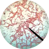 B. subtilis spores can survive the extreme heat during cooking. Some B. subtilis strains are responsible for causing ropiness or rope spoilage – a sticky, stringy consistency caused by bacterial production of long-chain polysaccharides – in spoiled bread dough and baked goods.[57] For a long time, bread ropiness was associated uniquely with B. subtilis species by biochemical tests. Molecular assays (randomly amplified polymorphic DNA PCR assay, denaturing gradient gel electrophoresis analysis, and sequencing of the V3 region of 16S ribosomal DNA) revealed greater Bacillus species variety in ropy breads, which all seems to have a positive amylase activity and high heat resistance.[58] B. subtilis CU1 (2 × 109 spores per day) was evaluated in a 16-week study (10 days administration of probiotic, followed by 18 days wash-out period per each month; repeated same procedure for total 4 months) to healthy subjects. B. subtilis CU1 was found to be safe and well tolerated in the subjects without any side effects.[59]