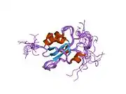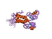 The dual repeat BRCT domain of the BRCA1 protein is an elongated structure approximately 70 Å long and 30–35 Å wide.[32] The 85–95 amino acid domains in BRCT can be found as single modules or as multiple tandem repeats containing two domains.[33] Both of these possibilities can occur in a single protein in a variety of different conformations.[32] The C-terminal BRCT region of the BRCA1 protein is essential for repair of DNA, transcription regulation and tumor suppressor function.[34] In BRCA1 the dual tandem repeat BRCT domains are arranged in a head-to-tail-fashion in the three-dimensional structure, burying 1600 Å of hydrophobic, solvent-accessible surface area in the interface. These all contribute to the tightly packed knob-in-hole structure that comprises the interface. These homologous domains interact to control cellular responses to DNA damage. A missense mutation at the interface of these two proteins can perturb the cell cycle, resulting a greater risk of developing cancer.