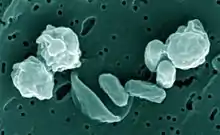 | Colored micrograph of Bacillus odysseyi spores taken by a field-emission environmental SEM and magnified by 107. Spherical figures (about 2 µm diameter) are intact spores with exosporia. In center of image, spores (rod-shaped) were exposed to 0.5 mrad gamma radiation for 60 min, thus the exosporium (ribbon-shaped) separated.[1] | |