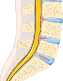 Spinal disk disease occurs when the nucleus pulposus, a gel-like material in the inner core of the vertebral disc, ruptures.[18] Rupturing of the nucleus pulposus can lead to compression of nerve roots.[19] Symptoms may be unilateral or bilateral, and correlate to the region of the spine affected. The most common region for spinal disk disease is at L4–L5 or L5–S1.[19] The risk for lumbar disc disease is increased in overweight individuals due to the increased compressive force on the nucleus pulposus, and is twice as likely to occur in men.[18][20] A 2002 study found that lifestyle factors such as night shift work and lack of sporting activity can also increase the risk of lumbar disk disease.[21]