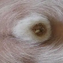 In dogs, balanoposthitis is caused by a disruption in the integumentary system, such as a wound or intrusion of a foreign body. A dog with this condition behaves normally, with the exception of excessive licking at the prepuce, and a yellow green, pus-like discharge is usually present. In sheep (rams/wethers), ulcerative enzootic balanoposthitis is caused by the Corynebacterium renale group (C. renale, C. pilosum & C. cystidis). For the condition in bulls, caused by a virus see Bovine herpesvirus 1. Balanoposthitis is believed to have contributed to the decline to near-extinction of Gilbert's potoroo.[15]