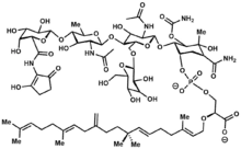 Bambermycin (flavomycin) is a complex of antibiotics obtained from Streptomyces bambergiensis and Streptomyces ghanaensis used as a food additive for beef cattle, dairy cattle,[1] poultry and swine.[2] The complex consists mainly of moenomycins A and C.[3]