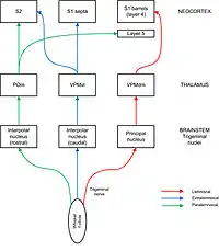 Sensory information flows from whisker follicles to barrel cortex via the trigeminal nerve nuclei and the thalamus. Barrel like divisions can be seen in some, but not all parts of the trigeminal nuclei (where they are called barrelets) and the thalamus (where they are called barreloids). The trigeminal nerve carries afferent fibres from the follicles into the brainstem where they connect to neurons in four different trigeminal nerve nuclei: principal, interpolar, oral, and caudal. Projections from the trigeminal nuclei to the thalamus are split into pathways designated lemniscal, extralemniscal, and paralemniscal. In the lemniscal pathway, axons from the principal trigeminal nucleus cross over the midline and project to “barreloids” in the thalamus, specifically in the dorsomedial section of the ventroposterior medial nucleus (VPMdm). Neurons in VPMdm project mainly to barrels in layer 4 of primary somatosensory cortex (S1). In the extralemniscal pathway, neurons of the interpolar nucleus project to the ventrolateral section of the ventroposterior medial nucleus (VPMvl). Neurons in VPMvl project to septa between the barrels and to secondary somatosensory cortex (S2). The paralemniscal pathway runs from the interpolar trigeminal nucleus via posterior nucleus (POm) of the thalamus to S2 and to diffuse targets in barrel cortex especially layer 5. Each pathway also has secondary projections to other layers within barrel cortex and other regions of cortex, including motor cortex.[7] These different pathways are thought to transmit different modalities of sensory information from the whisker.[2][8]
