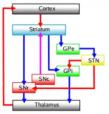 The basal ganglia is a collective group of structures in the brain. These include the striatum, (composed of the putamen and caudate nucleus), globus pallidus, substantia nigra, and the subthalamic nucleus. Along with other structures, the basal ganglia are part of a neural circuit that is integral to voluntary motor function.[1] It was once believed that the primary function of the basal ganglia was to integrate projections from the cerebral cortex, and project information via the thalamus to the motor cortex. Research has shown that the basal ganglia can be modeled as a group of components of parallel, re-entrant cortico-subcortical circuits, which originate in cortical areas, traverse the basal ganglia and terminate in specific areas in the frontal lobe.[4] These areas are thought to control not only motor function but also oculomotor, prefrontal, associative, and limbic areas.[2] Understanding these circuits has led to breakthroughs in understanding the disorders of the basal ganglia.