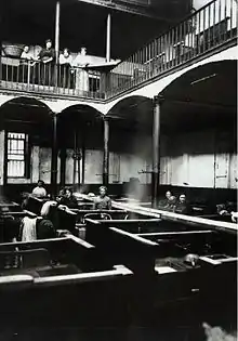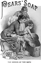 The popularity of wash-houses was spurred by the newspaper interest in Kitty Wilkinson, an Irish immigrant "wife of a labourer" who became known as the Saint of the Slums.[26] In 1832, during a cholera epidemic, Wilkinson took the initiative to offer the use of her house and yard to neighbours to wash their clothes, at a charge of a penny per week,[11] and showed them how to use a chloride of lime (bleach) to get them clean. She was supported by the District Provident Society and William Rathbone. In 1842 Wilkinson was appointed baths superintendent.[27][28]